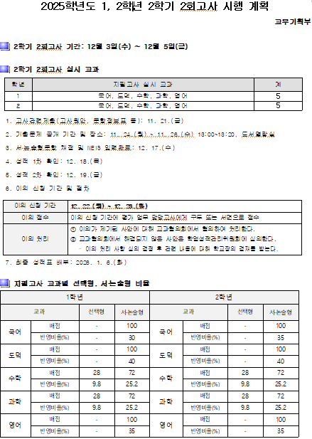 2025학년도 1, 2학년 2학기 2회고사 실시 계획을 안내하오니, 자녀 교육에 활용하시기 바랍니다.